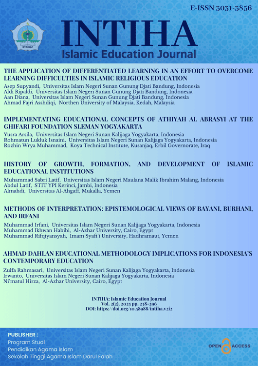 Islamic EducationVol. 2 No. 2 (2025)This issue has been available online since April 2025. All articles in this issue (5 original research articles), were authored/co-authored by 16 authors from 9 different institutions (Al-Azhar University, Cairo; Imam Syafi’i University, Hadhramaut; Koya Technical Institute, Kusanjaq, Erbil Governorate,; Northen University of Malaysia, Kedah; STIT YPI Kerinci, Jambi; Universitas Al-Ahgaff, Mukalla; Universitas Islam Negeri Maulana Malik Ibrahim Malang; Universitas Islam Negeri Sunan Gunung Djati Bandung; Universitas Islam Negeri Sunan Kalijaga Yogyakarta) and 5 different countries (Egypt, Indonesia, Iraq, Malaysia, Yemen)